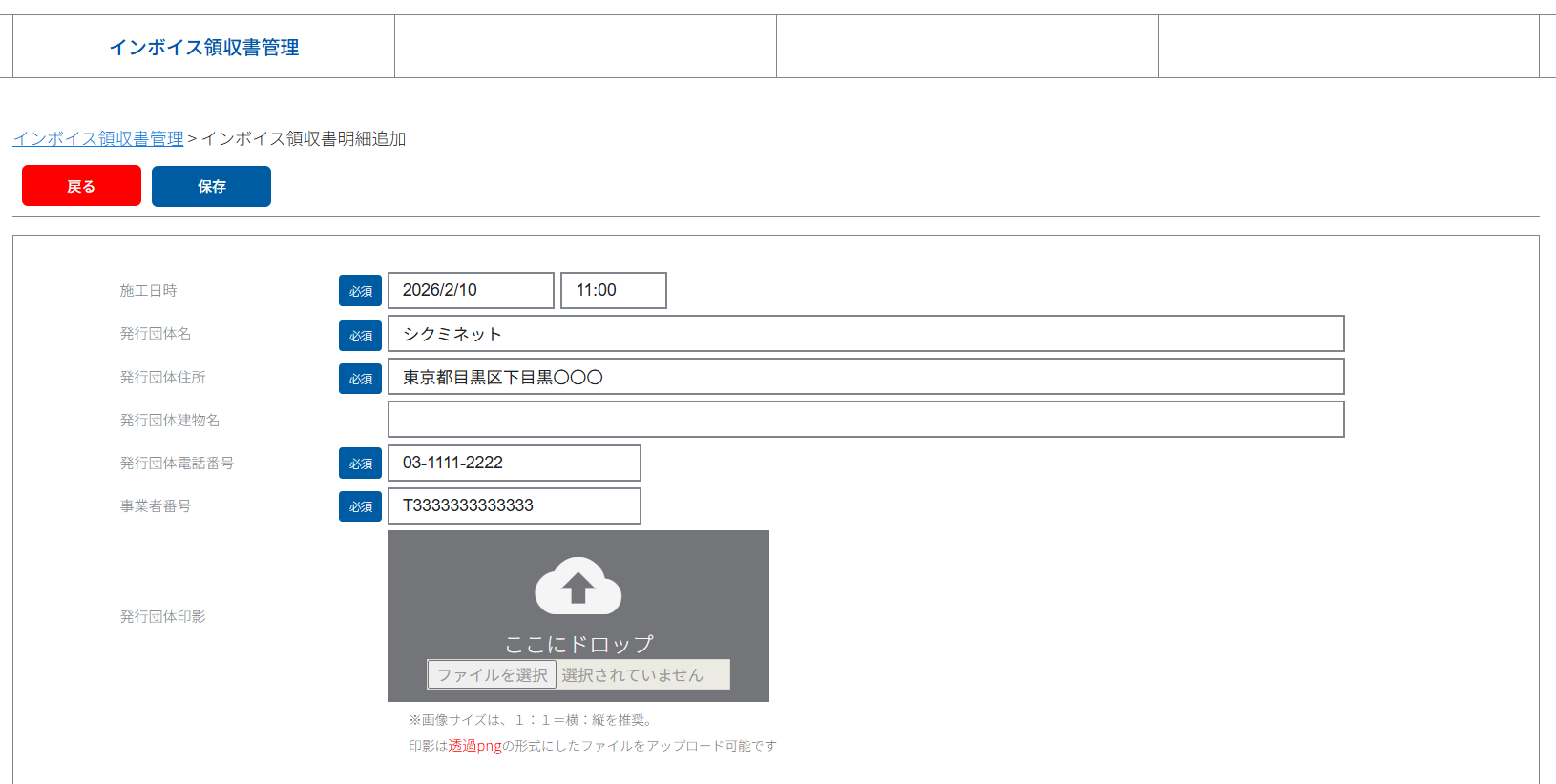 ③発行団体情報を入力し、入会金・会費・オプションの課税区分を「課税」「軽減」「課税対象外」より選択します。完了したら「保存」をクリックします。