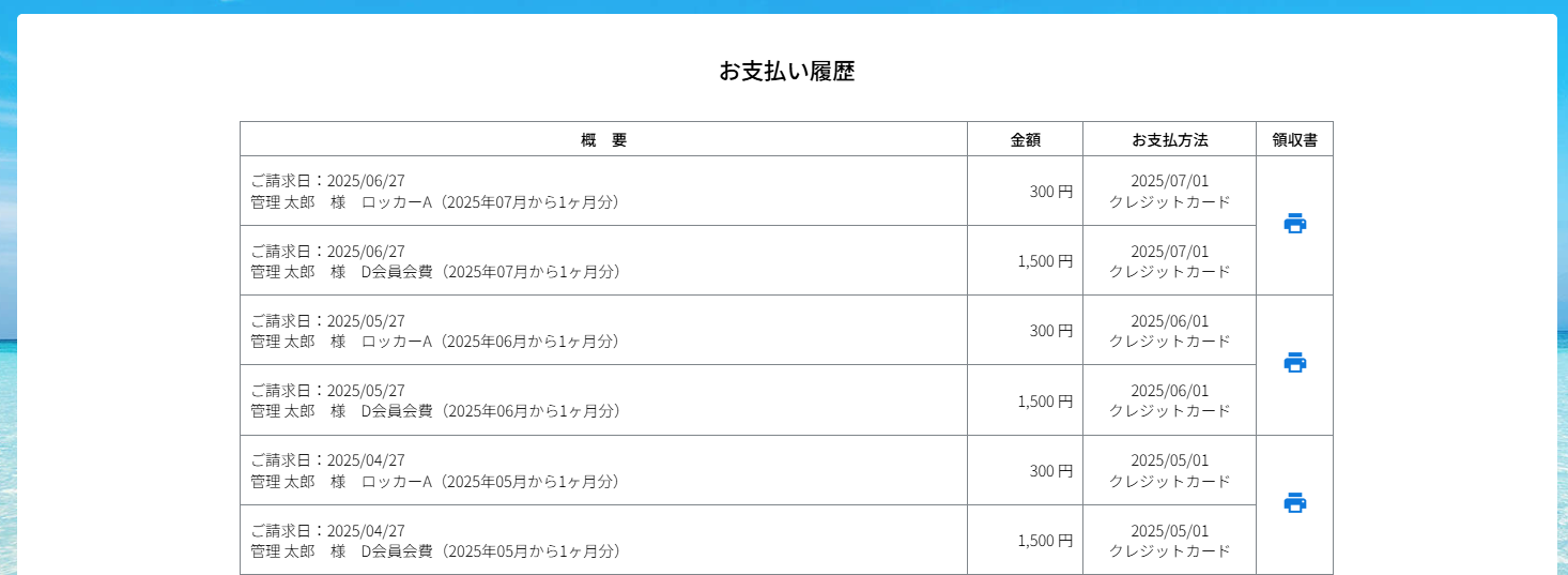 ②お支払い履歴の中の領収書を発行したい明細の領収書欄のアイコンをクリックします。