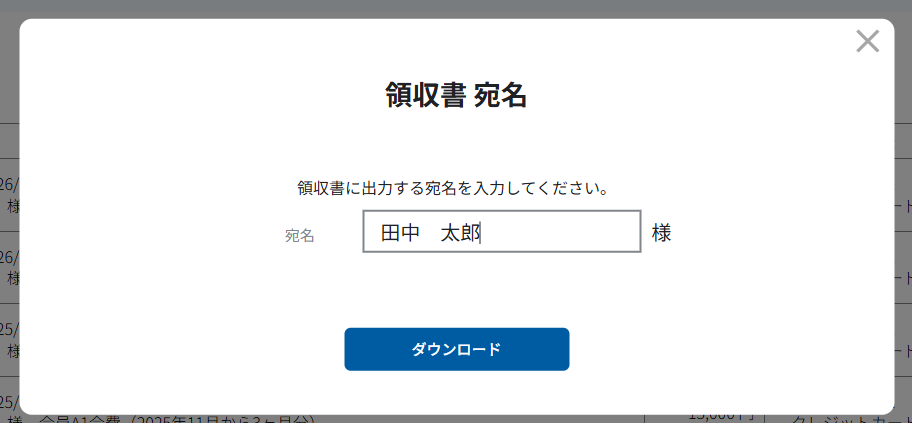 ③ご希望の領収書の宛名を入力し、「ダウンロード」をクリックします。